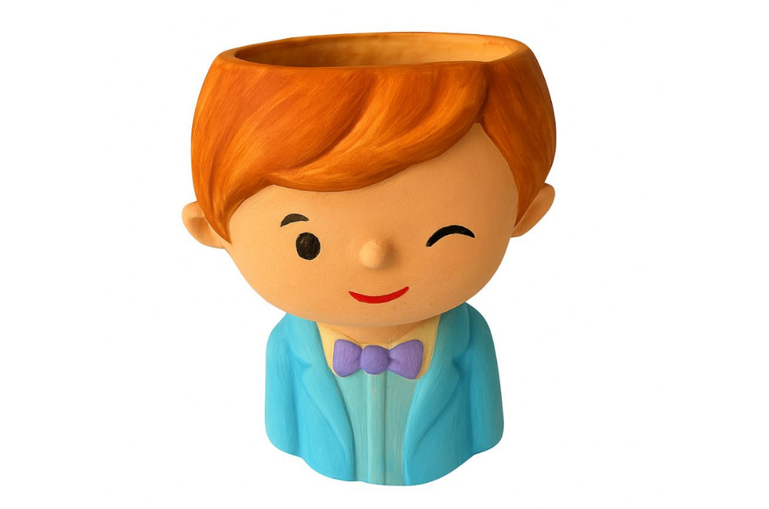 Succulent Erkek Saksı: minik erkek çocuk figürlü, çiçek ve sukulentler için uygundur. Çocukların boyama keyfini yaşatırken dekoratif ve öğretici bir etkinlik sunar.